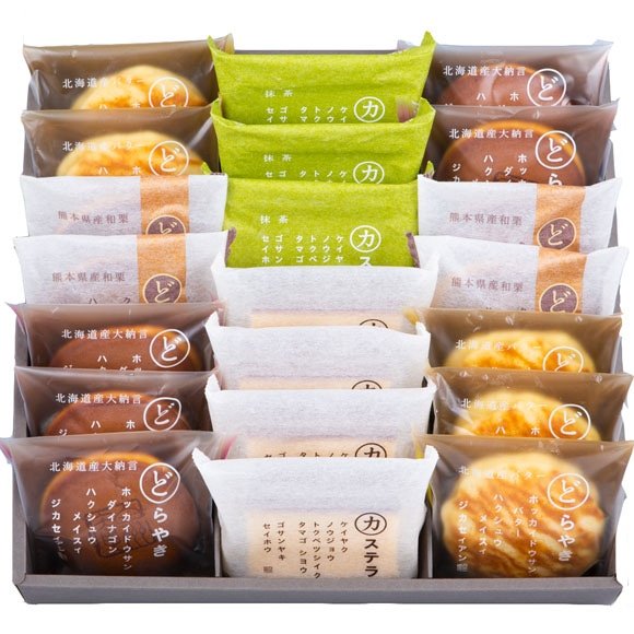 - 詰合せ内容:21個入(北海道バターどらやき×5個、大納言どらやき×5個、和栗どらやき×4個、カステラ×4個、抹茶カステラ×3個