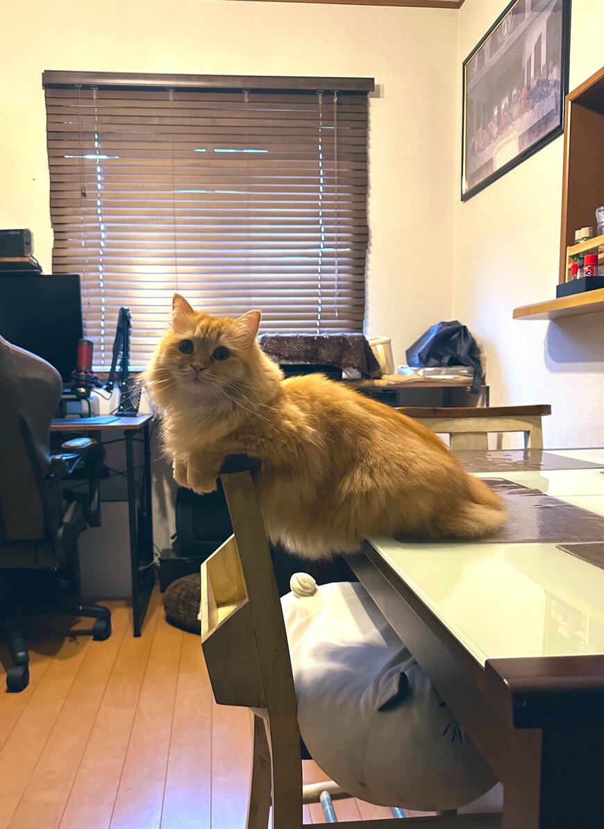 足をテーブルに置き、上半身はイスにもたれかかってバランスをとっている様子。間から見えるお腹のモフモフ感が目を惹きます。