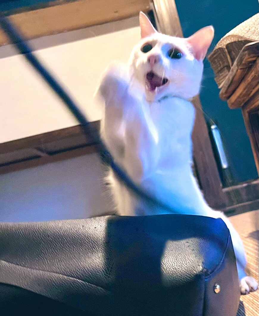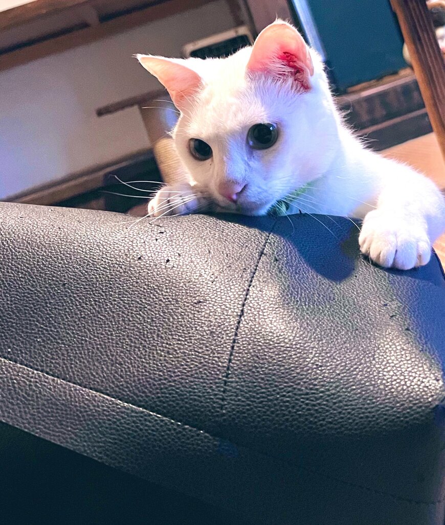 緑の瞳を輝かせる白猫さん、手を掛けているのは…