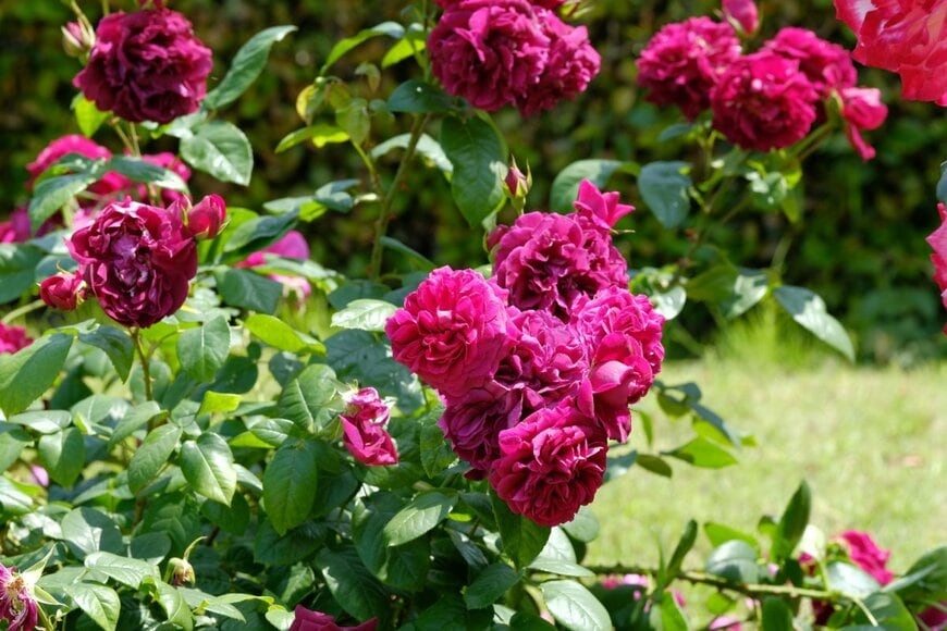 コロンとしたピンクの花がクラシカルで、オールドローズの風情を漂わせるギィドゥモーパッサン。花弁の数が多く、ゴージャスなたたずまいで庭が華やかに。