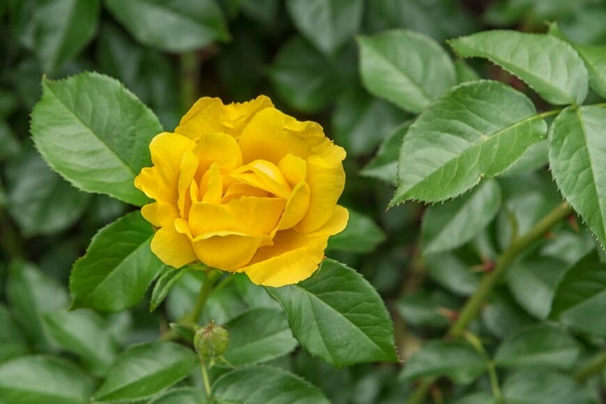 鮮やかな黄色い花が、庭を明るく彩るレモンフィズ。シンプルな半八重の花はナチュラルな印象で、周りの草花ともよく調和します。暑さにも病気にも強く、初心者でも育てやすいバラです。