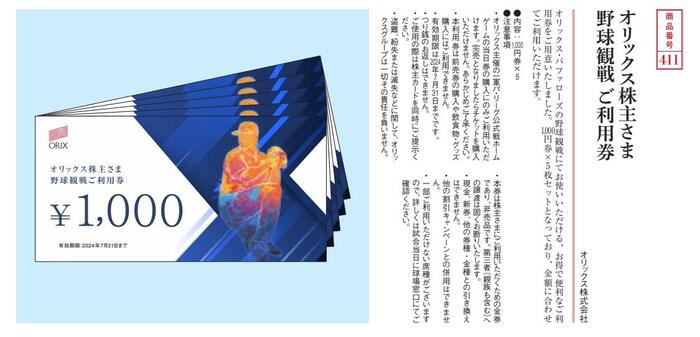 ふるさと優待の選べる商品のなかに「オリックス株主さま野球観戦 ご優待券」(1000円券×5)があります。