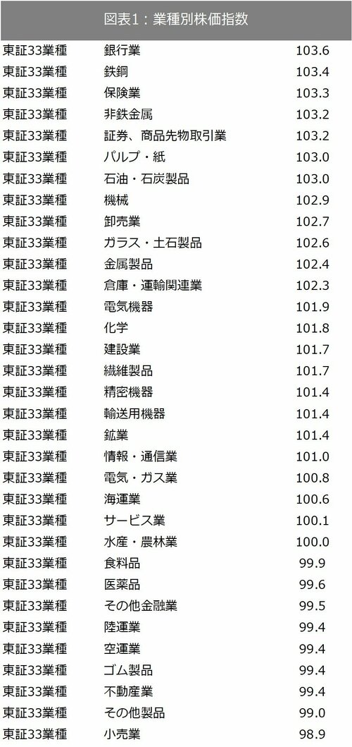 今週は、銀行業株、鉄鋼株、保険業株を始め、23業種が上昇。水産・農林業株のみ変わらず。