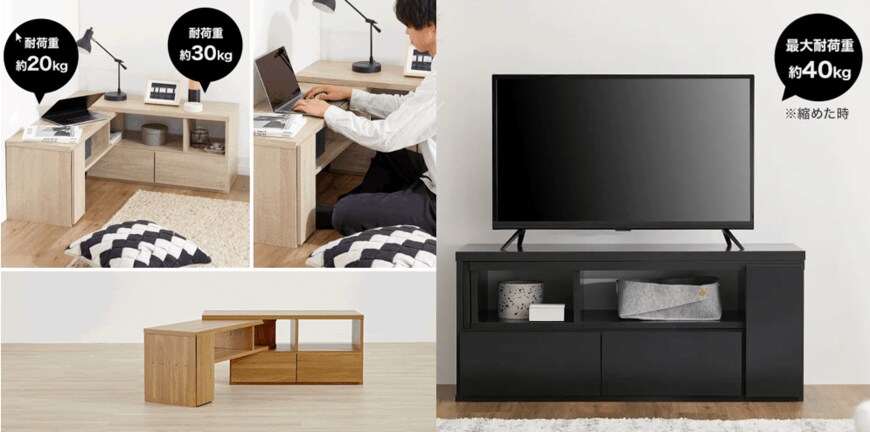 さらにユニークなのが、角度の調整もできること。部屋の隅に沿って90°の角度をつけることもできるので、テレビボードとしてだけでなく作業机としても利用することができます。耐荷重は約20kg(高さのある側は約30kg)なので、PCや書籍なども安心して設置可能です。