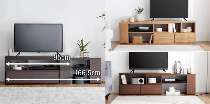 伸縮式テレビ台はその名の通り、スライドで横幅を調整することが可能。調整幅も95~166.5cmと広いので、一人暮らしのワンルームからファミリー向けの広いリビングまで部屋に合わせてアジャストさせることができます。また、左右のパーツを入れ替えることも可能。テレビは50V型まで設置することができます。