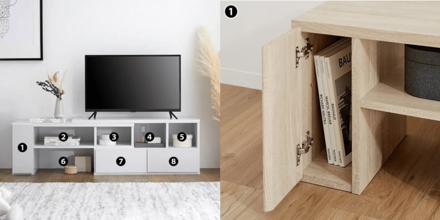 伸縮式テレビ台は最大まで伸ばした状態で、8つに仕切られた収納スペースを利用できます。見せるスペース/見せないスペースが分かれているので、実用的に使いつつおしゃれなインテリアとしても活用する、といった使い方ができそうです。縦長形状の開き戸は、雑誌や説明書を入れておくのにうってつけです。