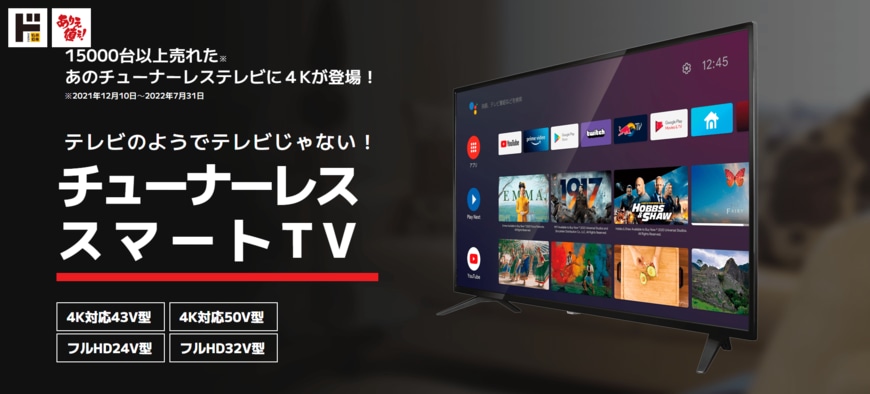 新製品は「SmaTY」という名称で、2023年7月13日に+Style Amazon店で販売を開始しました。画面サイズは43V型で、解像度は4K(3840×2160)となっています。搭載しているOSはAndroid OSで、YouTubeやNetflixなどはプリインストールされています。もちろんその他のアプリもあとからGoogle Playストア経由でインストールすることが可能です。