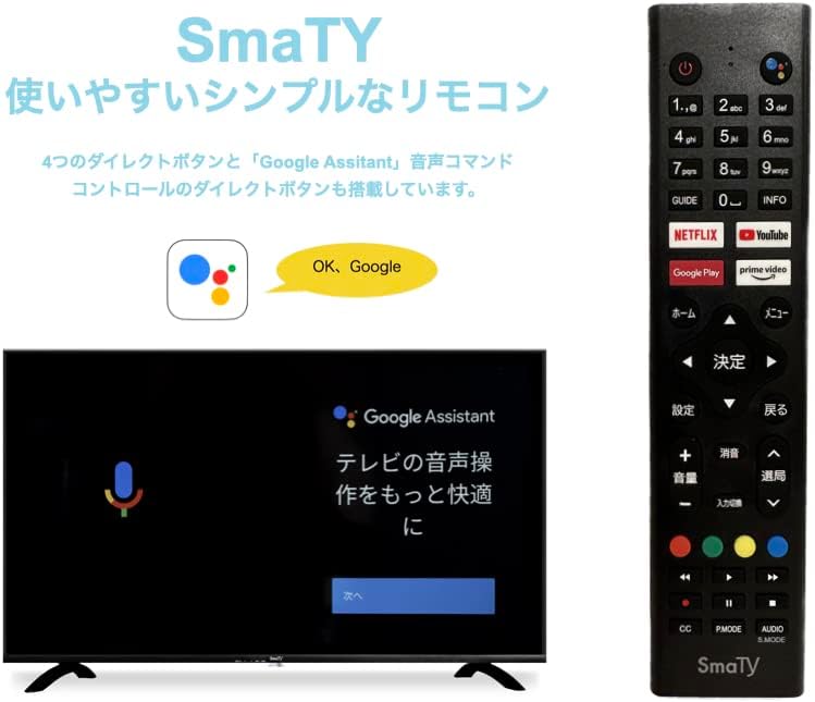 画質だけでなくオーディオにもこだわっており、Dolby Audioによる大画面にふさわしい臨場感のあるサウンドも楽しめます。専用リモコンは4つのアプリ(Netflix、YouTube、Google Play、Prime Video)やGoogle Assistantのダイレクトボタンを備えているので、誰でも直感的に操作することができます。