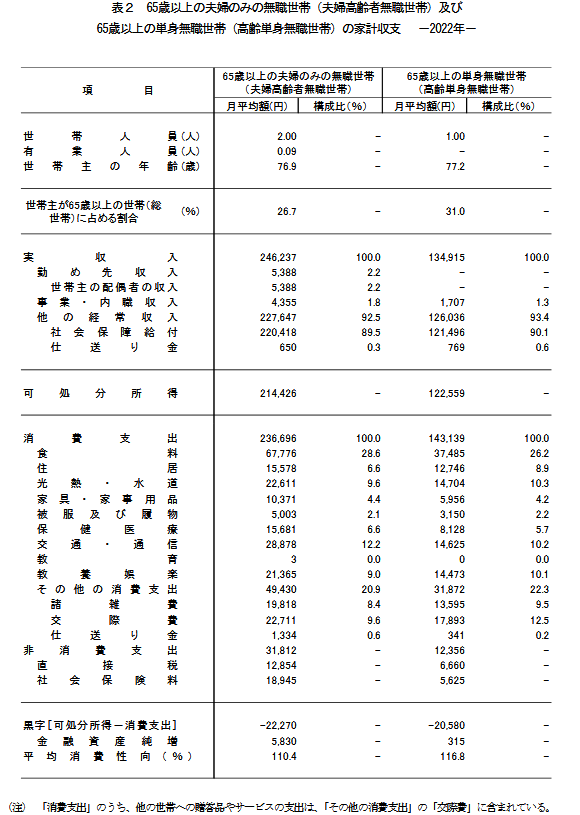 総務省統計局の「家計調査報告(家計収支編)2022年(令和4年)平均結果の概要」によると、「65歳以上の夫婦のみの無職世帯」と「65歳以上の単身無職世帯」の非消費支出(税金と社会保険料)は以下のとおりでした。