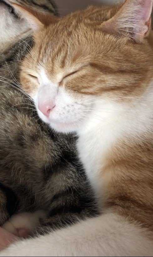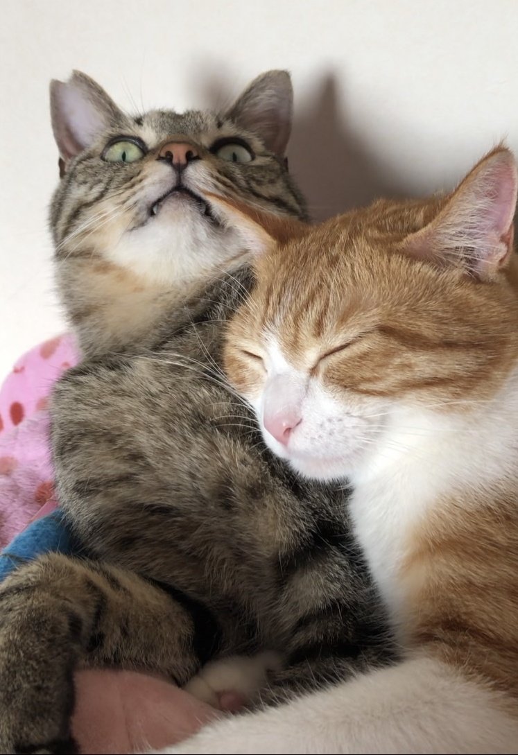 「幸せに満ちた妹猫ちゃんと、のけぞる兄猫さんに笑っちゃいました」