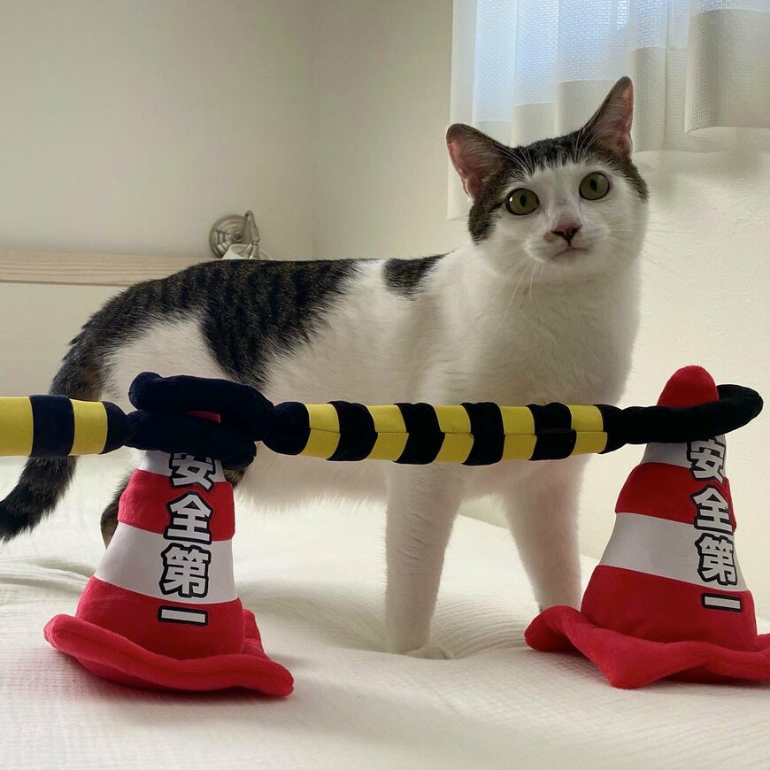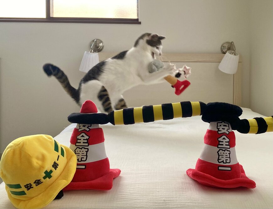 前髪のような、ヘルメットのような、とってもチャーミングな柄が印象的な猫の男の子です。おもちゃ遊びが大好きだというセロイくんはこの日、工事現場をモチーフにしたおもちゃに夢中になっていました。