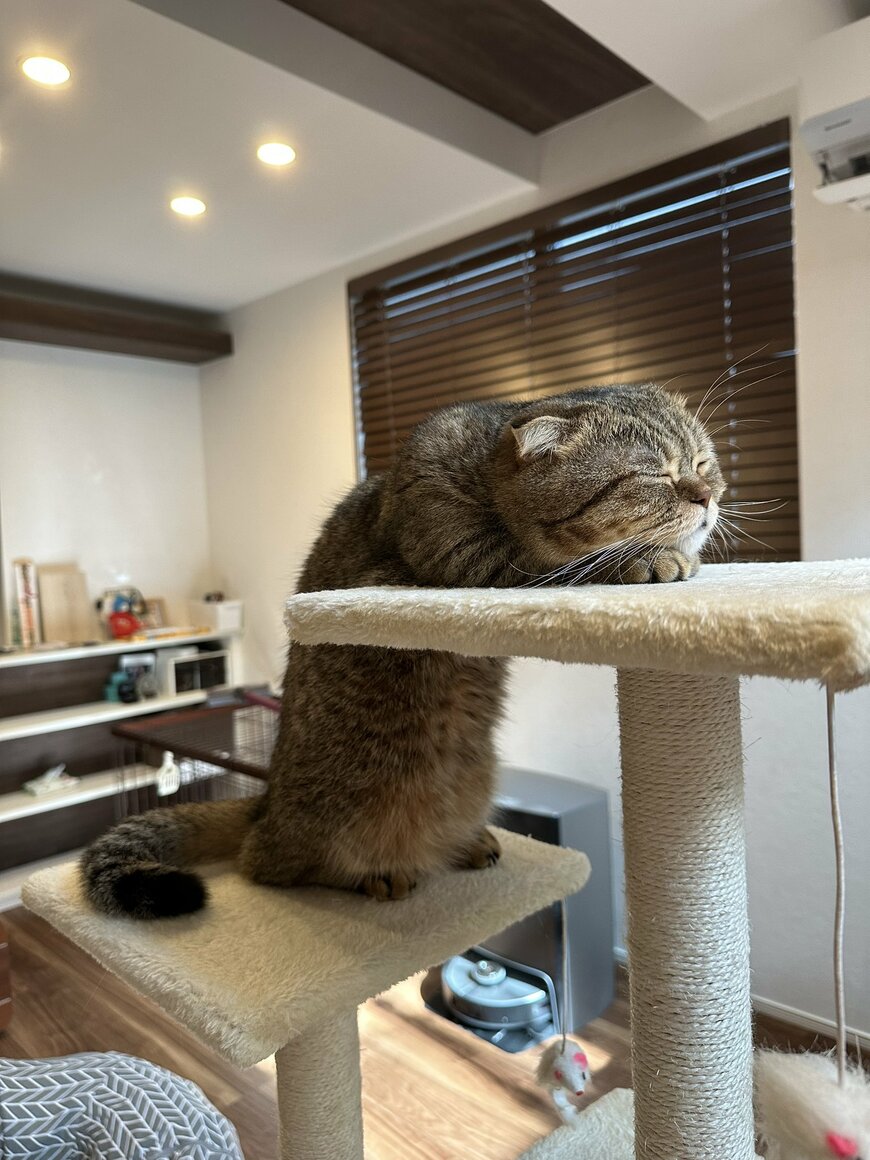 普段から立っちや豪快なへそ天姿を見せてくれるというたぬ吉くん。これまでもたびたび、キャットタワーで同じスタイルで眠ることがあったようで、たぬ吉くんにとってお気に入りの場所なのかもしれませんね。
