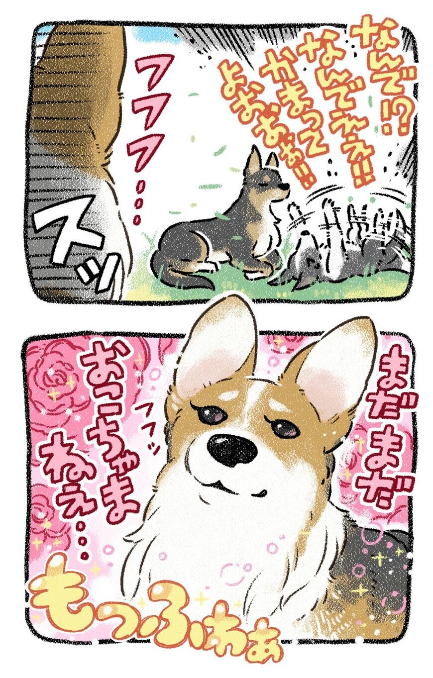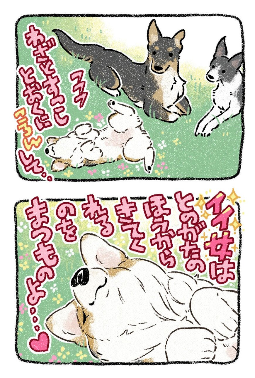 そんな二匹の様子を遠目に見つめるコーギーの女の子。大人の色気を放つコーギー姉さんは余裕のある様子で二匹に近づいてくると…。