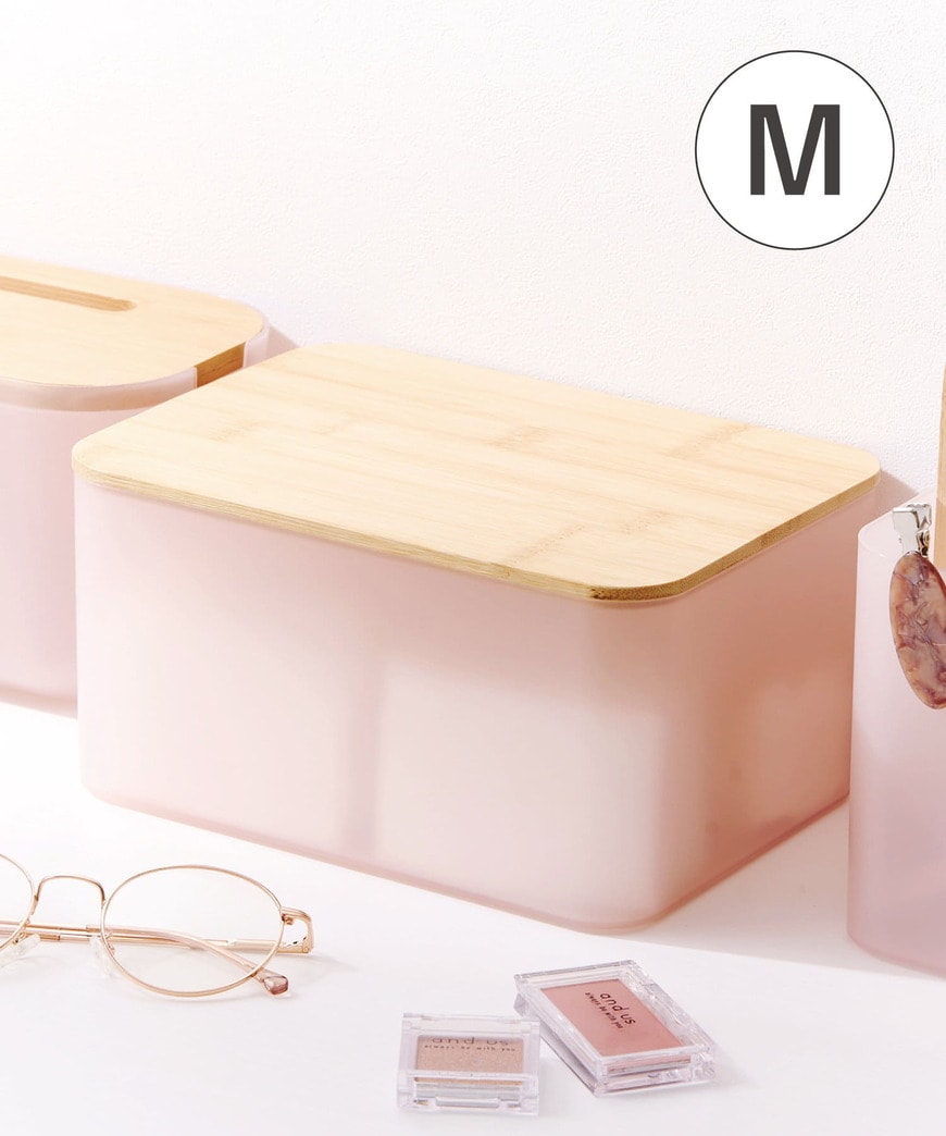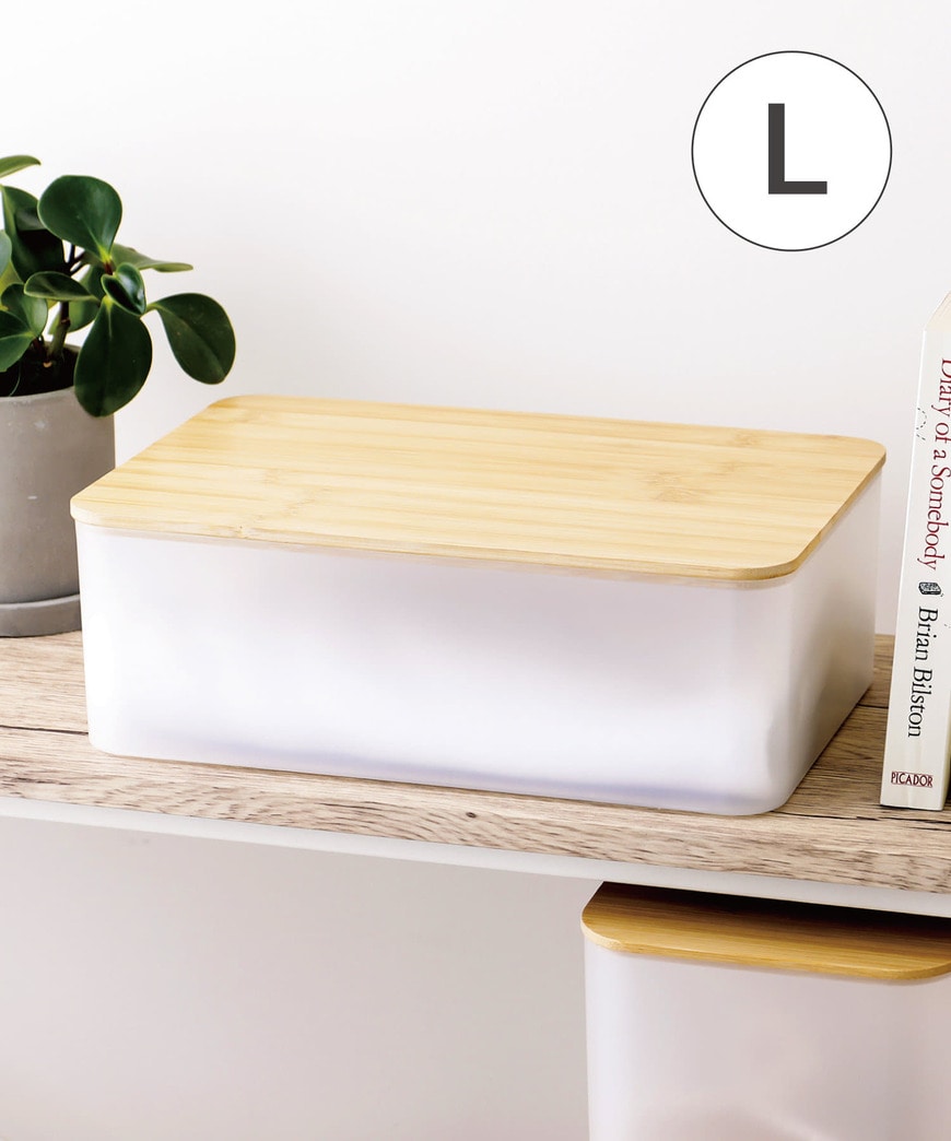 バンブーシリーズの中で最も大きいLサイズの収納ボックスです。半透明のボックスの上に竹製の蓋が付いているデザインで、さらにMサイズ・Sサイズを上にスタッキングすることもできます。
