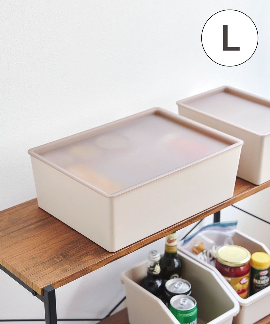 中身がうっすらと透けて見える蓋付き収納ボックスのシリーズで最も大きいサイズです。瓶や缶、パスタなどの食材を保管する際、ホコリが溜まらず、いざ使う時に衛生的ですぐ使える点が良いですね。