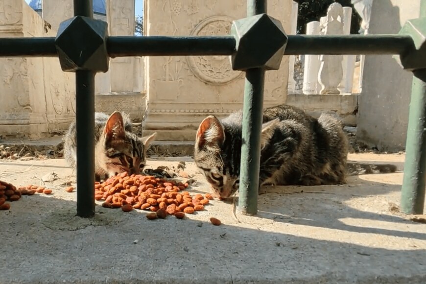 「たくさん食べる子猫の兄弟。神聖なモスクの敷地内では特にネコが大切にされます」というコメントとともに投稿されたのは、約20秒の動画でした。