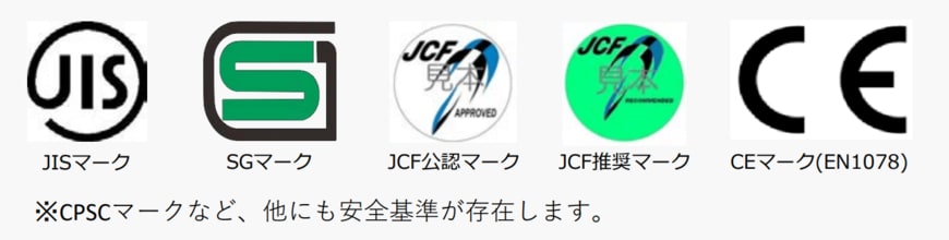 自転車用・特定小型原動機付自転車用ヘルメットの安全基準を示すものには、SGマーク(国内の任意規格である一般財団法人製品安全協会が定めた基準)、JCFマーク(公益財団法人日本自転車競技連盟が定めた基準)、CEマーク(欧州の規格)などがあります。