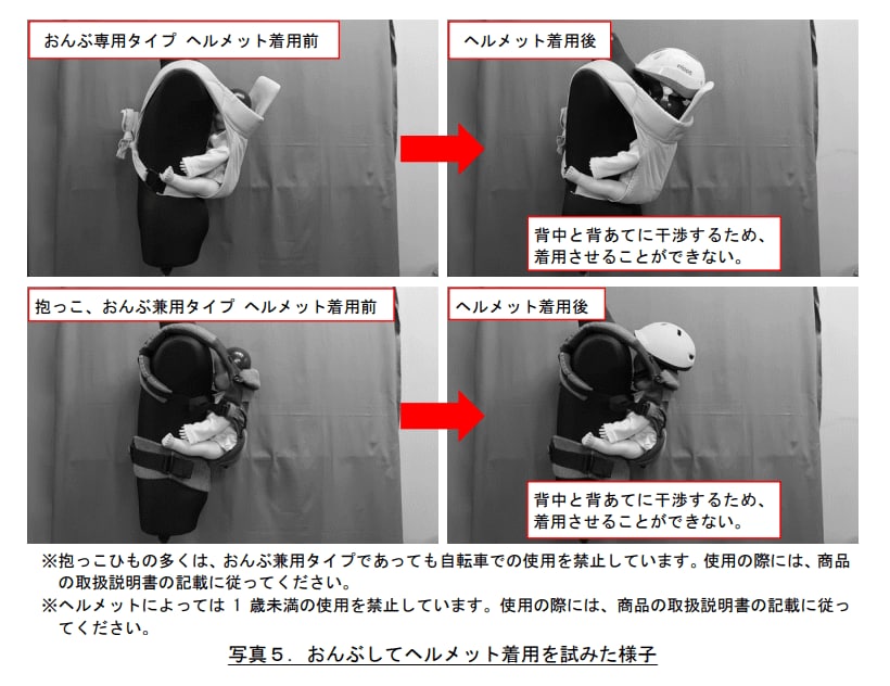 今回の注意喚起では粗悪品に対する警鐘のほか、1歳未満児のヘルメット着用に関する提言も行われています。都道府県公安委員会規則で首のすわった月齢4ヶ月以降の子どもはおんぶしての同乗が認められていますが、これは危険なのでやめましょうというものです。