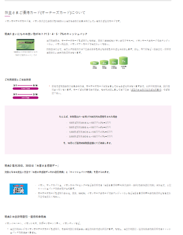 イオンは決算期(2023年2月期)現在、100株以上保有する方に向けて「株主さまご優待カード(オーナーズカード)」を年2回、提供しています。