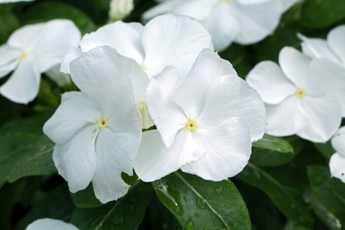 ホワイトのニチニチソウと個性的な組み合わせを楽しむなら、ホワイトの葉が美しいカラジウムを組み合わせてみましょう。独特の模様と葉形で、寄せ植えをオシャレに演出します。カラジウムは徐々に光に慣らしていけば、花壇に植えて楽しむことができます。