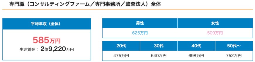 専門職(コンサルティングファーム/専門事務所/監査法人)の平均年収は585万円となっており、男性は625万円、女性は509万円が平均となっています。
