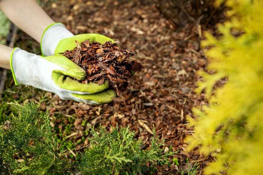腐葉土やマルチバークなどのマルチング材は、水の蒸発を抑えて乾燥から植物を守ります。水やりの手間を軽減するとともに、強い日差しで根が傷むのを防ぐのに効果的。株元だけでなく株間にもマルチング材を敷き詰めておくと、雑草が生えにくくなり草抜きの手間もかかりません。