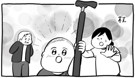なんとベベダモ君は、おばあちゃんが持っていた「杖」に大興奮していたのです。杖が大きな棒に見えたのでしょうか。高々とおばあちゃんの杖を掲げているベベダモ君を見ていると、男の子の棒好きは世界共通なんだということが分かりますね。