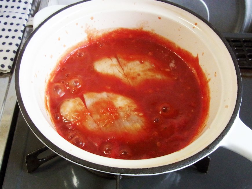おいしく食べた後の茶碗洗いの間に、ぶりのトマト煮で残ったトマト缶を鍋にあけ、塩麴とみりんをいれて弱火で煮詰めておくと、翌日のごはんやパスタ、肉や魚にかけてよしの、トマトソースができあがりますよ♪