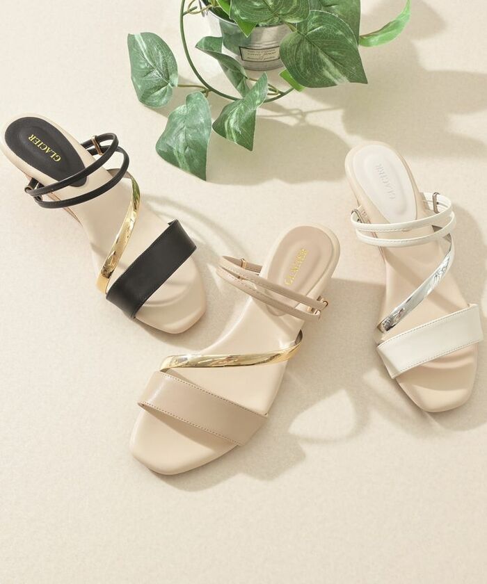 大人の夏コーデが楽しめる夏らしく抜け感のあるデザインのサンダルです。シンプルなフォルムにメタリックな配色カラーがアクセントに。2Way仕様でミュール風にさっと履くのはもちろん、後ろのストラップをかかとにかければ安定感のある履き心地になります。