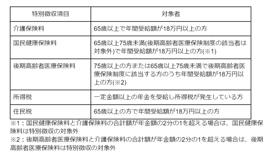 厚生年金から天引きされるものとして以下のような項目があり、それぞれ対象となる条件が決められています。なお、厚生年金から天引きすることを「特別徴収」といいます。