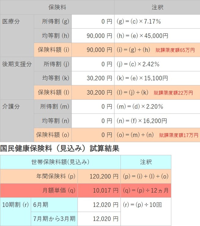 このモデルケースにおいて、国民健康保険料(医療分・後期支援分・介護分)は年額12万200円となります。