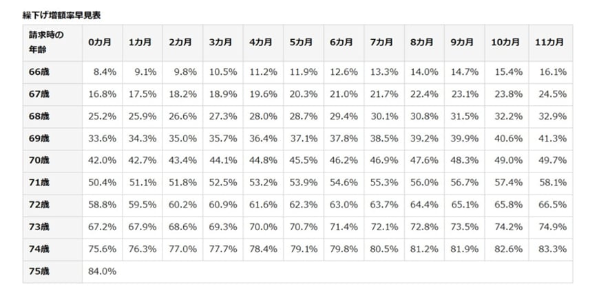 66歳から75歳まで1歳刻みで繰下げた場合の増額と受給額を以下にまとめました。