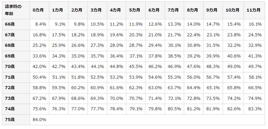 これにより、増加率は1ヶ月遅らせるごとに0.7%。1年間遅らせると8.4%になります。最大で75歳まで繰下げできるので、年金は84%増やせます※。