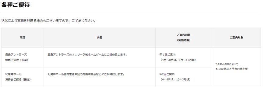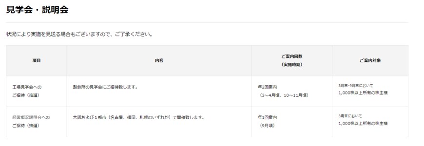 日本製鉄は1000株以上所有の株主を対象に、工場見学会や経営概況説明会への招待(抽選)を、5000株以上所有の株主を対象に各種優待を行っています。