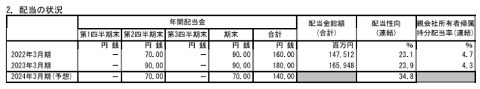 日本製鉄の株式を1年前に買い、持ち続けたとすると、「2023年3月期の中間配当」と「2023年3月期の期末配当」の計2回を受け取ることができます。