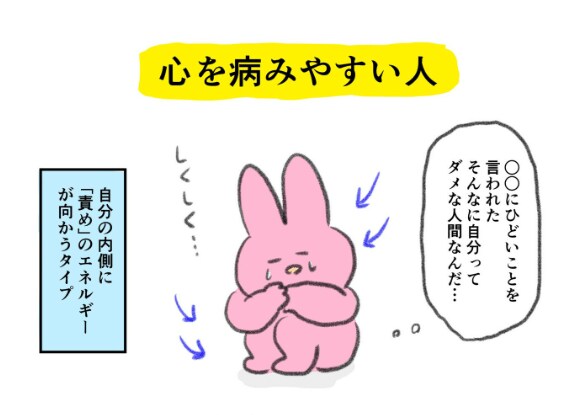 「心を病みやすい人」と書かれているウサギは、人から受けた悪口を「責め」のエネルギーにして自分に向けてしまっています。どんどん自分を責めていては、心がボロボロになってしまうのも無理はありません。