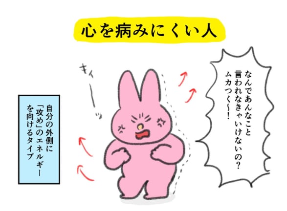 対する「心を病みにくい人」と描かれたウサギは、悪口に対して「ムカつく~!」と、怒りを「攻め」のエネルギーに変えて上手に発散しています。