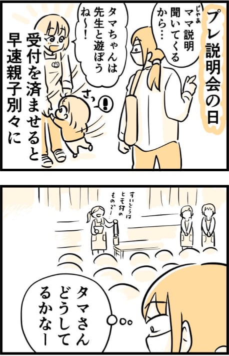 「@kaogakyutai」さんと、2歳の女の子「タマ」ちゃんは、幼稚園の説明会に参加していました。説明会は大人だけが参加するので、タマちゃんは別室に移動します。今まであまり我が子と離れたことのない「@kaogakyutai」さんは、「どうしてるかな…」とやや不安そうな様子…。