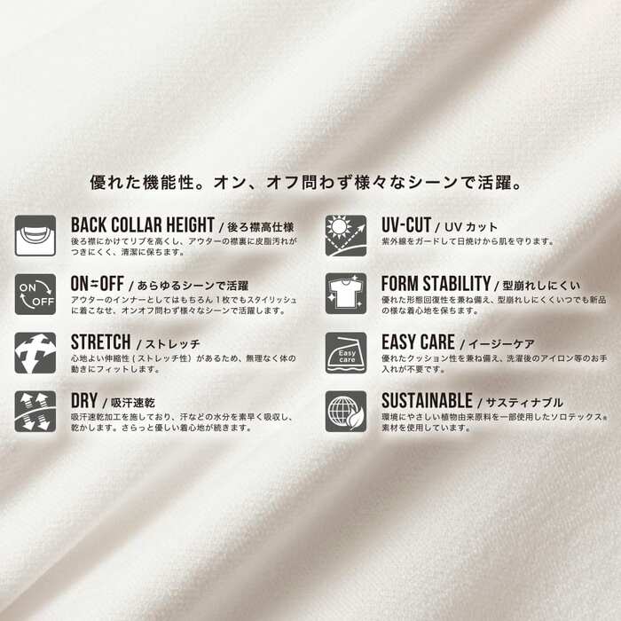 後ろ襟にかけてリブが高くなっているので、アウターの襟裏に皮脂汚れがつきにくく、清潔に保てます。ブラウスやジャケットのインナーとしてはもちろん、1枚で着てもスタイリッシュに着こなせ、様々なシーンで活躍してくれます。
