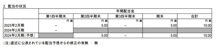 吉野家ホールディングスの株式を1年前に買い、持ち続けたとすると、「2023年2月期の中間配当」と「2023年2月期の期末配当」の計2回を受け取ることができます。