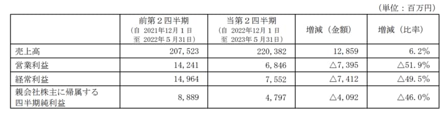 キユーピー株式会社(2678)(以下「同社」という)が、2023年11月期第2四半期(上期)連結決算(対象期間:2022年12月1日~2023年5月31日)を発表した。