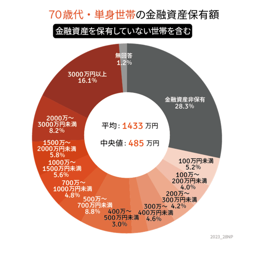 70歳代ひとり世帯の貯蓄額の平均は、1433万円です。平均値は上下の大きな数字に影響を受けるため、より実態に近い中央値で見ると485万円と大幅に少ないことが分かります。