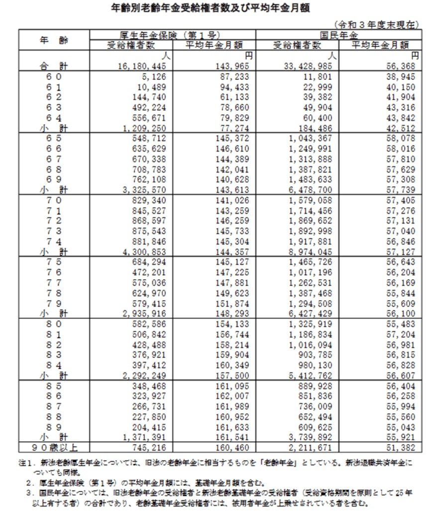 ここからは、70歳代の国民年金と厚生年金の平均受給月額を厚生労働省年金局「令和3年度 厚生年金保険・国民年金事業の概況」で確認します。