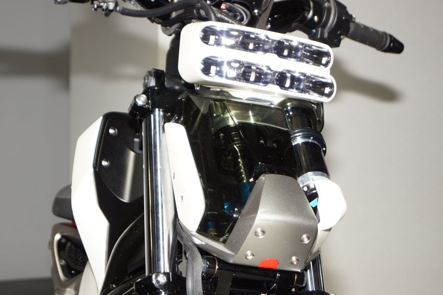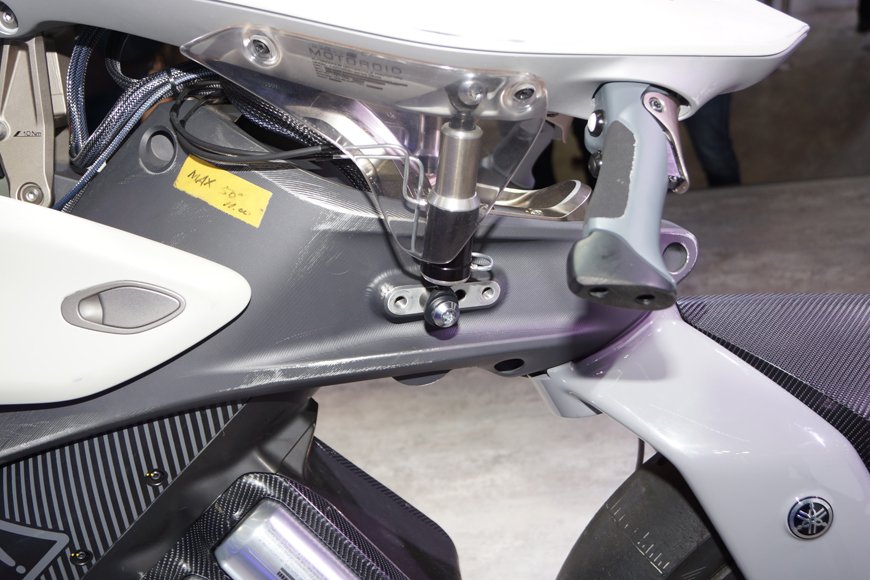 ヤマハがワールドプレミアした自立バイク「MOTOROiD」は、検証実験車両となるため、そもそもが発売を想定したモデルではない。そのため展示車両には擦り傷が各所で見られ、タイヤもショルダー部分まで減っているのを見ると、さまざまな過酷なテストを受けてきたというのがわかる。