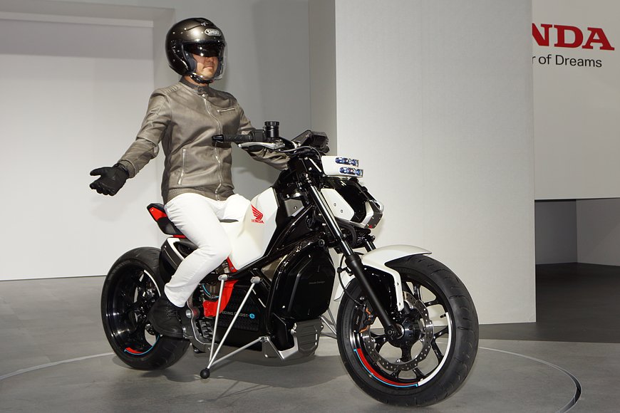 ホンダが展示した自立バイク「Honda Riding Assist-e」は、ASIMOに代表されるヒューマノイドロボット研究のバランス制御技術を、電動バイクに応用したもの。すでにCES2017で世界初公開されたホンダの「Honda Riding Assist」をEV化したモデルとなる。
