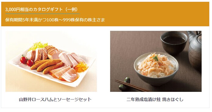 たとえば、100~999株を保有(保有期間5年未満)している場合、3000円相当のカタログギフトがもらえます。