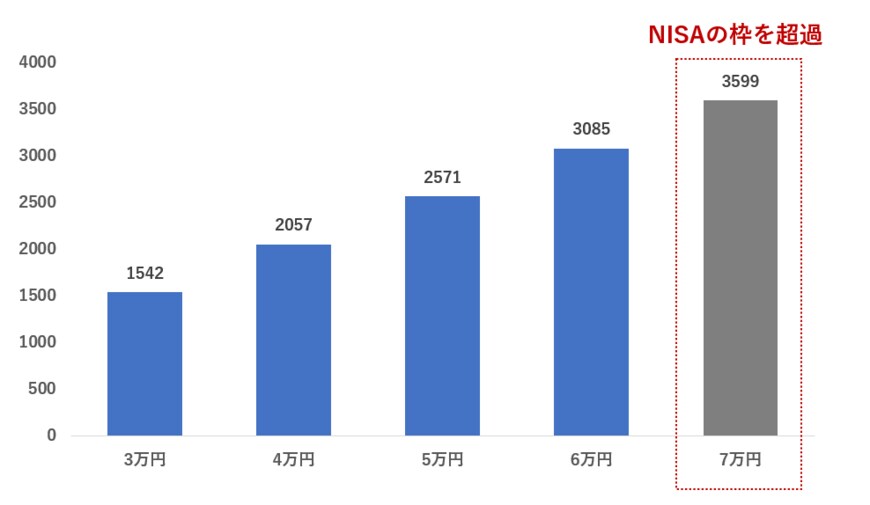 なお、NISAの枠組みの中で積立ができるのは月6万円までで、それ以上になると投資期間の途中でNISA枠を使い切ってしまいます。