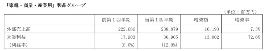 「家電・商業・産業用」製品グループは増収で、2022年3月期に実施した構造改革による大幅な固定費削減や原価改善が着実に進捗したことで、+72.6%の大幅増益となった。発電機やクリーンエネルギー市場の追い⾵を受け、海外⼦会社の収益性改善も進展している。