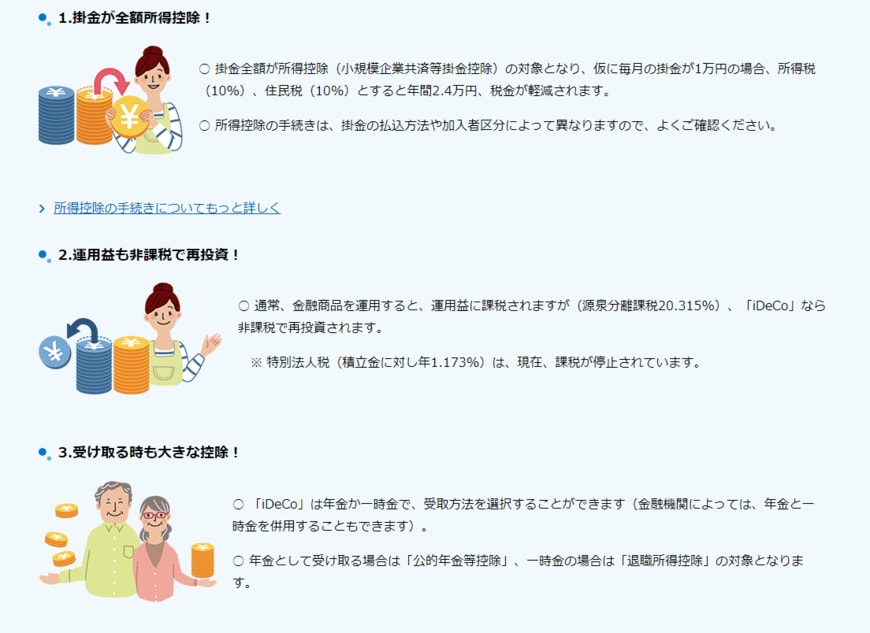 次に、iDeCoのメリットである税制上の優遇措置について解説します。