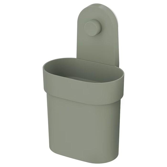 グレーグリーンの落ち着いたくすみカラーがキュートな小物入れ。強力な吸盤で、タイルなどの凹凸のない滑らかな面に設置できます。